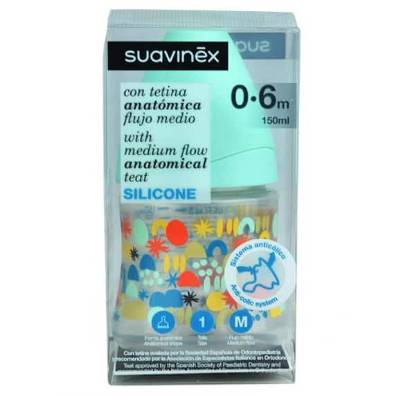 Biberón de flujo medio que cuenta con diferentes diseños florales. Posee una capacidad de 150 ml junto con una tetina de silicona y de forma anatómica, material que mantiene una deformación y una resistencia considerable frente a los mordiscos del bebé. Algunos de sus beneficios son: