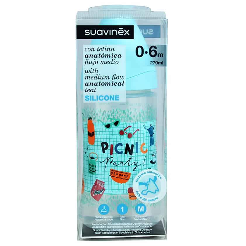 Biberón de flujo medio que cuenta con diferentes diseños florales. Posee una capacidad de 270 ml junto con una tetina de silicona y de forma anatómica, material que mantiene una deformación y una resistencia considerable frente a los mordiscos del bebé. Algunos de sus beneficios son: