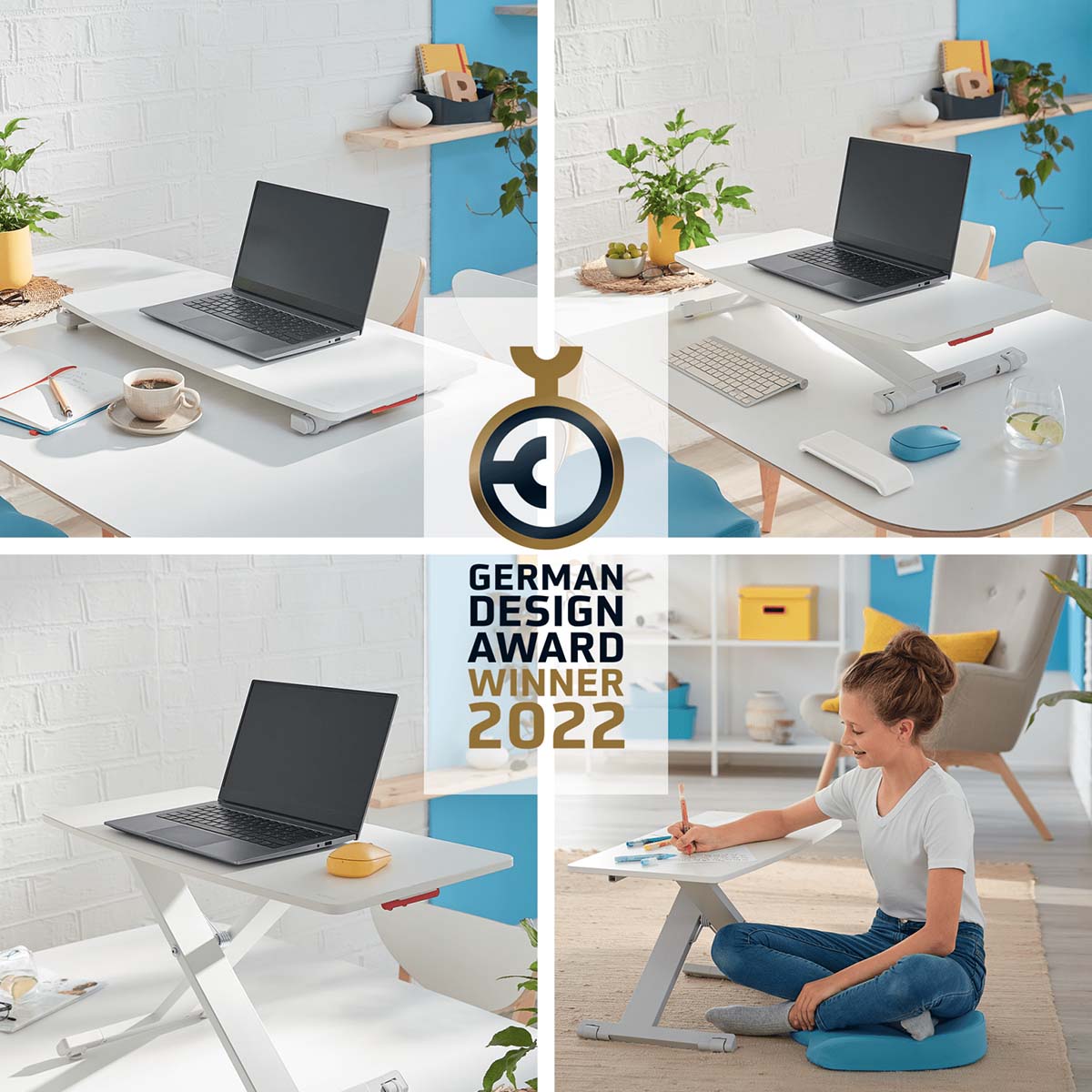 El convertidor de escritorio Leitz Ergo Cosy con bandeja deslizante para teclado y ratón permite la flexibilidad de moverse entre estar sentado y de pie mientras trabajas, fomentando el movimiento muscular, mejorando la postura y aumentando los niveles de energía.