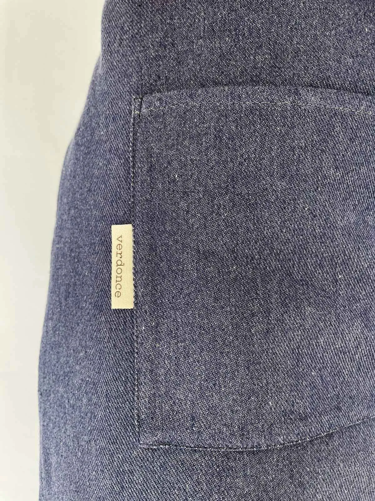 Nuestro delantal eco esta confeccionado artesanalmente a mano en España con una bonita y agradable tela eco vaquero de algodón reciclado de alta calidad.