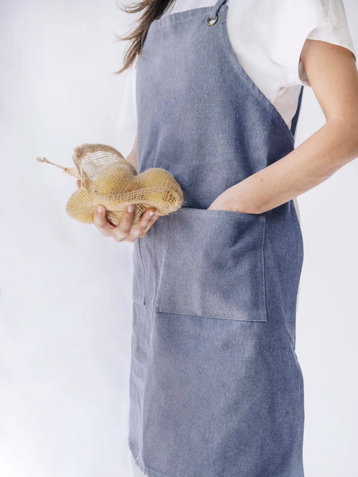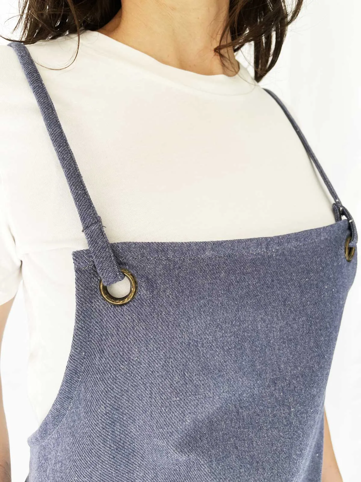 Estiloso y cómodo delantal denim de 100% algodón reciclado hecho con ética a mano en España. Una prenda eco y slow fashion sostenible. Al cruzarlo a la espalda pues ajustarlo fácilmente a tu medida.