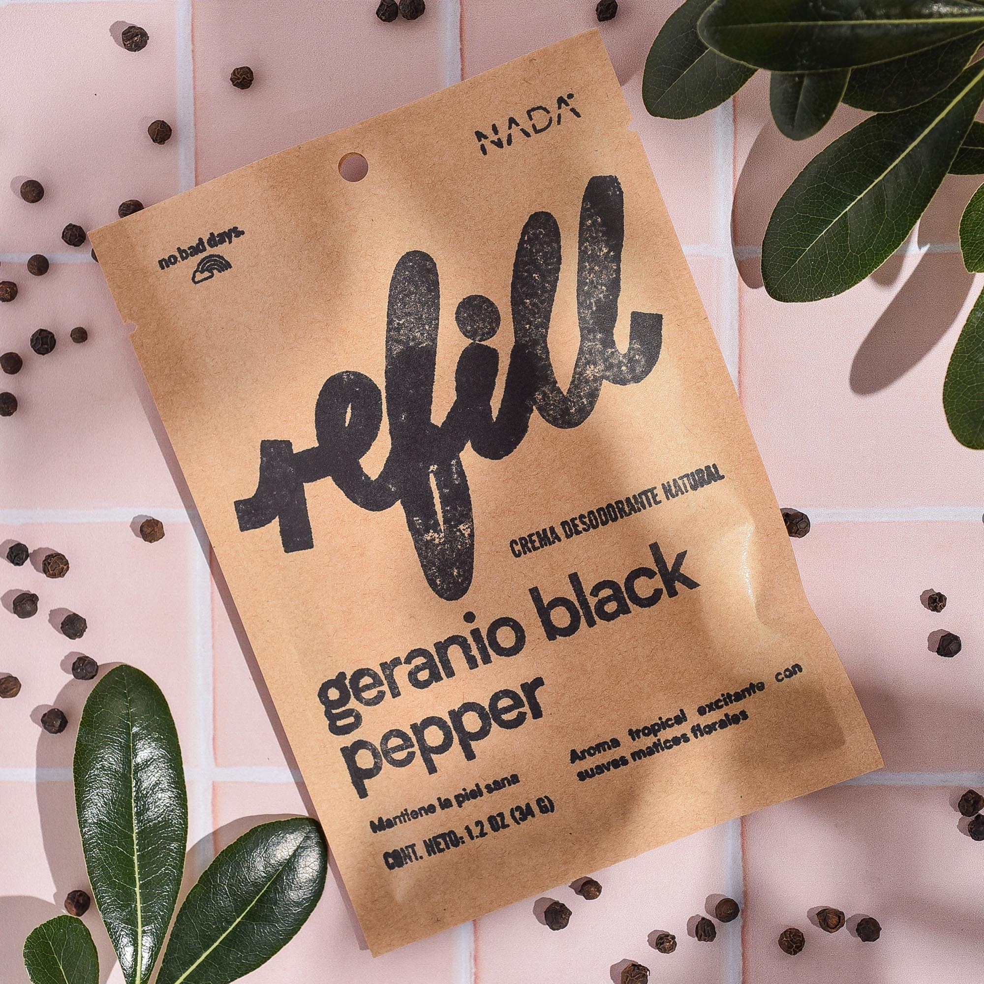 Nuestro desodorante natural Geranio Black Pepper está envasado en una bolsa kraft termosellada 100% compostable. Si eres de los nuestros y te encanta cuidar el planeta, entonces amarás el Refill. Aparte de ahorrar dinero, generarás muchísimo menos desperdicio rellenando. De hecho, no vas a generar ningún desperdicio. Lo único que tienes que hacer es remover con una cuchara el contenido de la bolsa y vaciarlo en tu envase favorito. Una vez removido todo el desodorante, simplemente deposita la bolsa en el compostero y en menos de 2 meses la bolsa se habrá descompuesto en abono orgánico. Remover y vaciar es algo súper rápido, no te tardas ni un minuto, y lo mejor es que puedes usar tu mismo envase una y otra vez, sin acumular absolutamente nada.