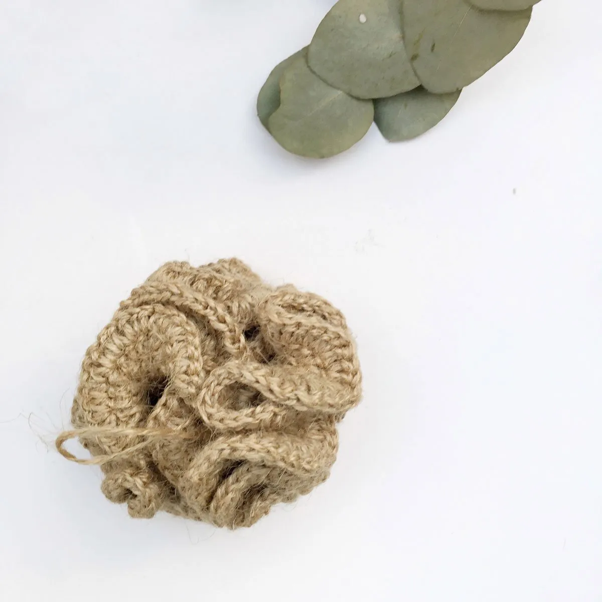 Esponja natural de yute para el baño. Esta esponja artesanal es totalmente natural; no saca nada del mar y no envía plástico de vuelta. Tejido a ganchillo con amor a partir de hilos de yute natural en España por mujeres locales en situaciones vulnerables. Un artículo con encanto y concienzudo para tu baño de residuo cero.