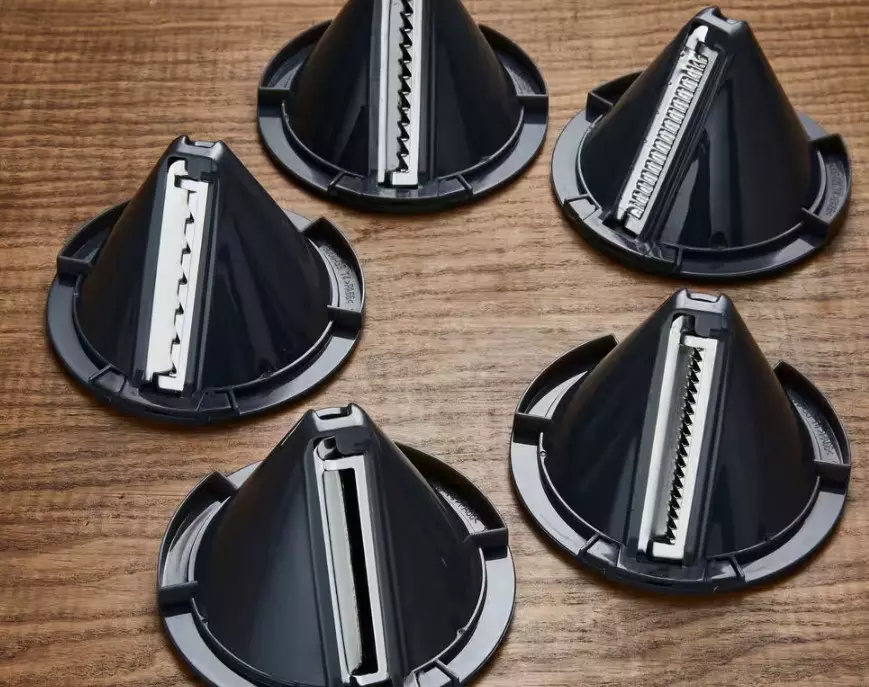 Este versátil accesorio incluye cinco cuchillas de acero inoxidable fáciles de ajustar que te permiten crear diferentes formas de pasta vegetal: