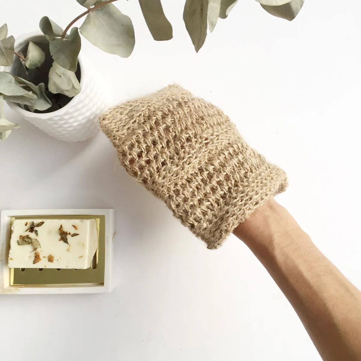 Pónte nuestra manopla de circulación de yute natural para revitalizar suavemente tu piel y evitar los exfoliantes que contienen microplásticos. Hecho a mano con amor en España a partir de hilo de yute por mujeres locales en situaciones vulnerables. Un producto ideal para tu rutina de belleza zero waste