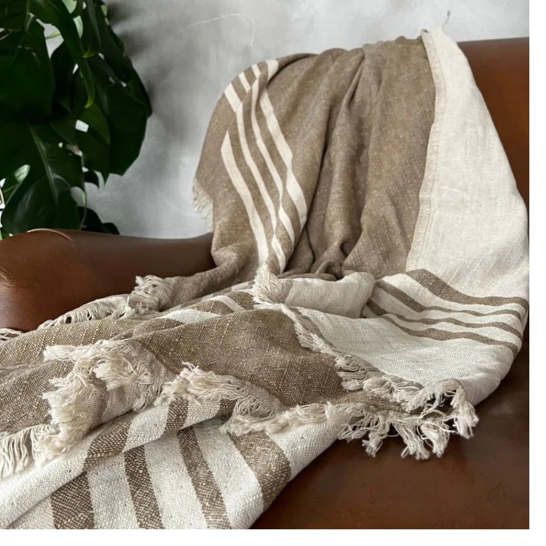 Es una manta que combina elegancia y sofisticación en su diseño. Confeccionada en un tejido suave y natural, presenta un delicado patrón de líneas que evocan un estilo clásico y atemporal. Su tono neutro y su textura acogedora la convierten en el complemento perfecto para cualquier espacio, aportando calidez y distinción. Ideal para momentos de relajación, «Atenea» invita a disfrutar del confort con un toque de refinamiento y sutileza.
