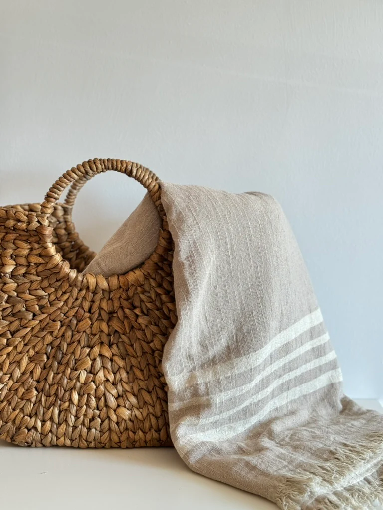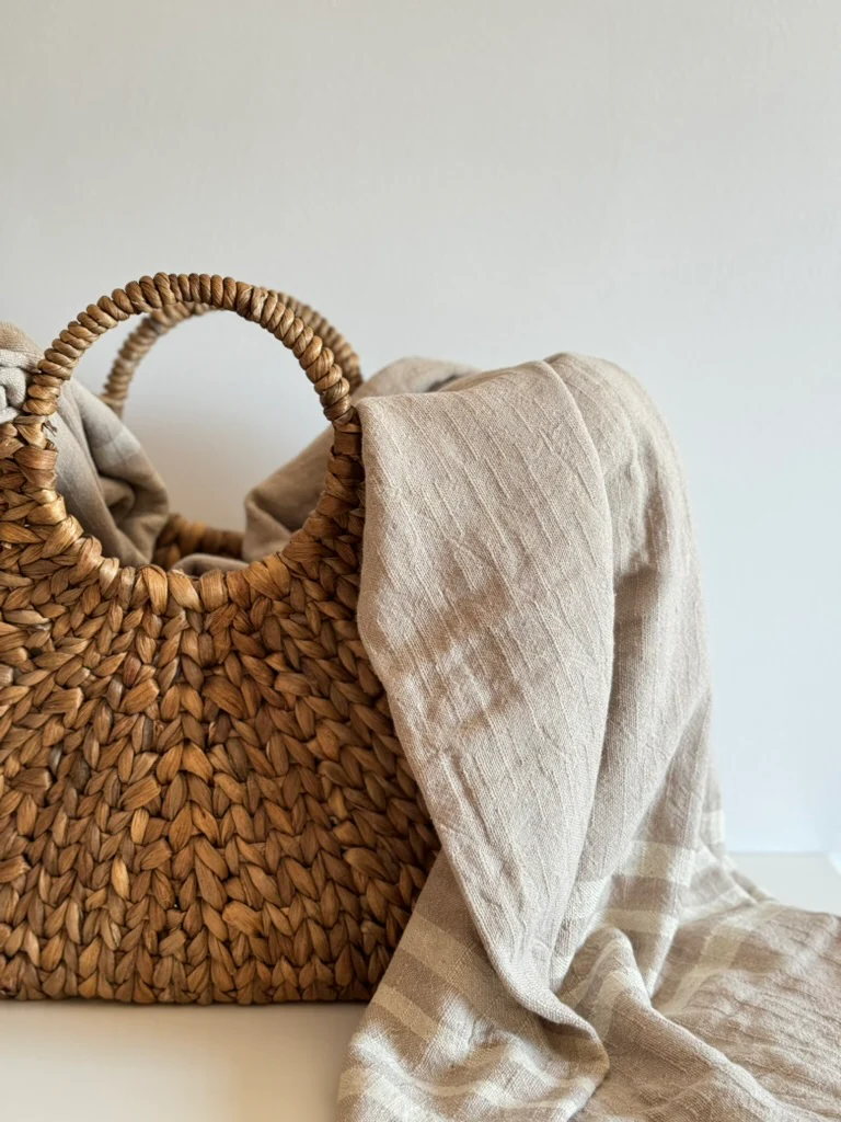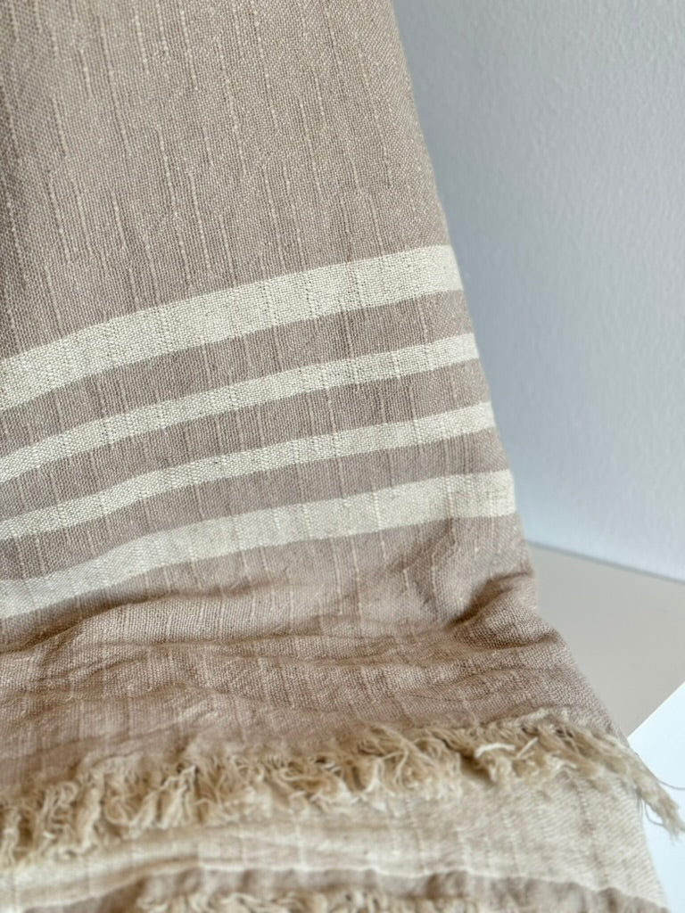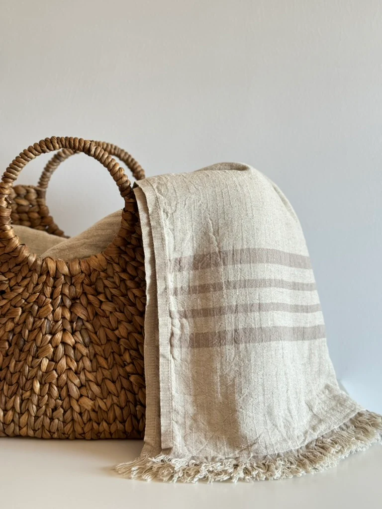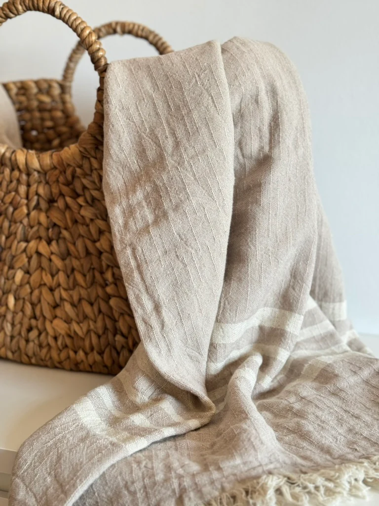 Es una manta que combina elegancia y sofisticación en su diseño. Confeccionada en un tejido suave y natural, presenta un delicado patrón de líneas que evocan un estilo clásico y atemporal. Su tono neutro y su textura acogedora la convierten en el complemento perfecto para cualquier espacio, aportando calidez y distinción. Ideal para momentos de relajación, «Atenea» invita a disfrutar del confort con un toque de refinamiento y sutileza.