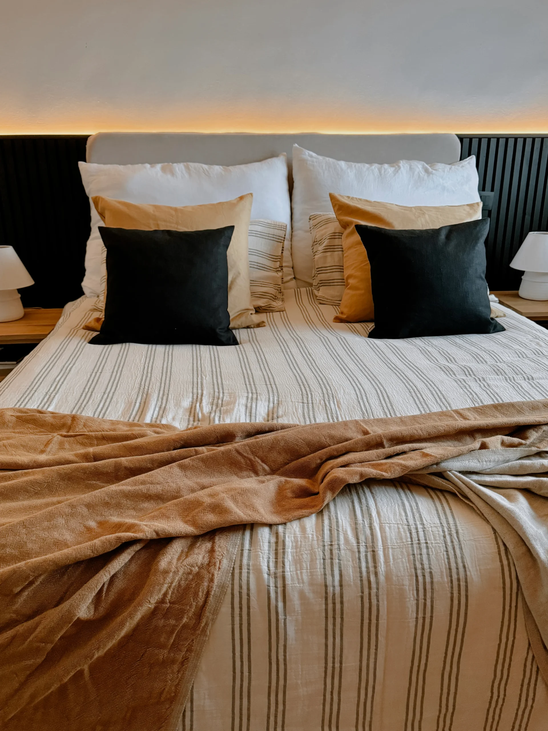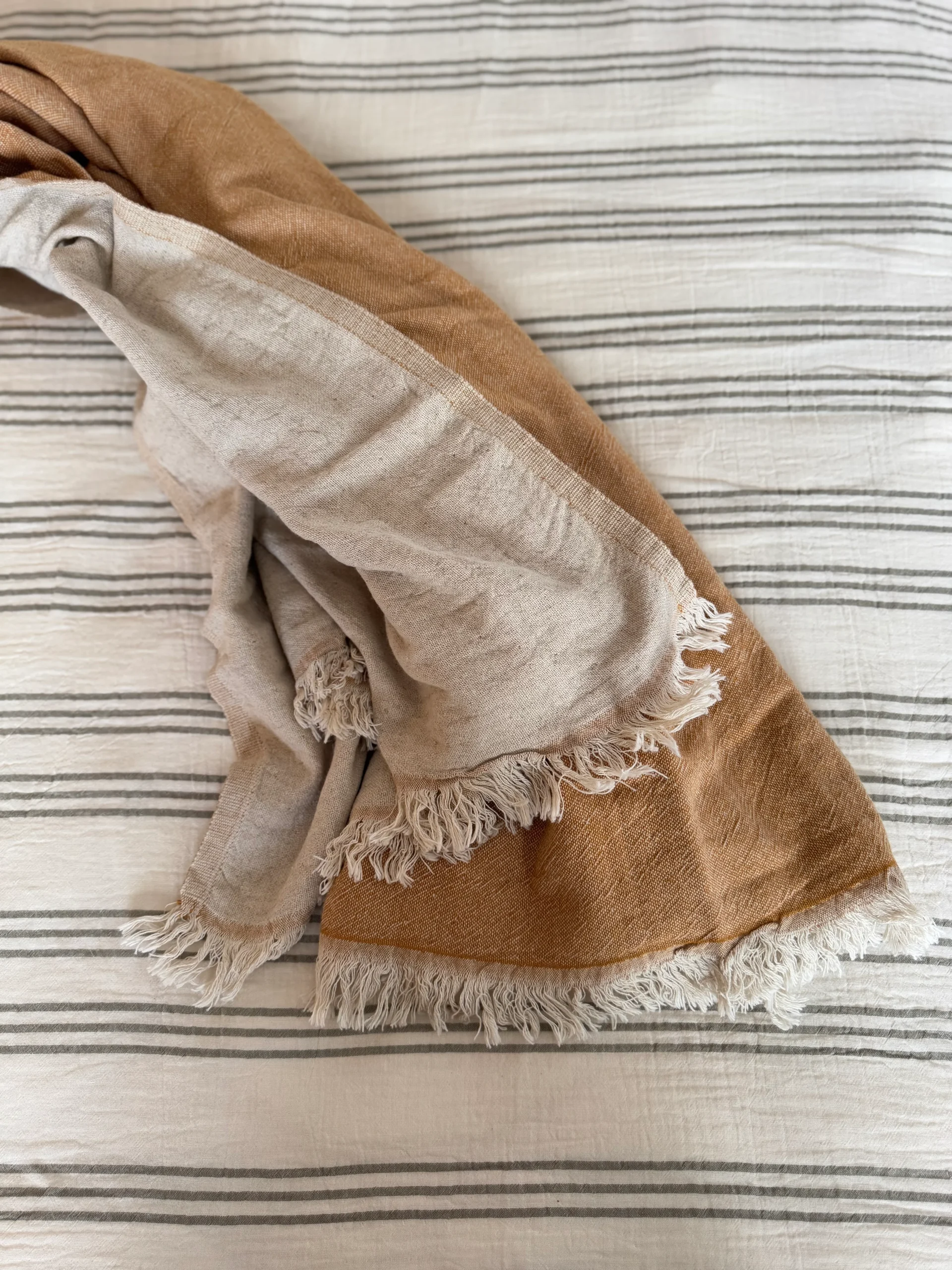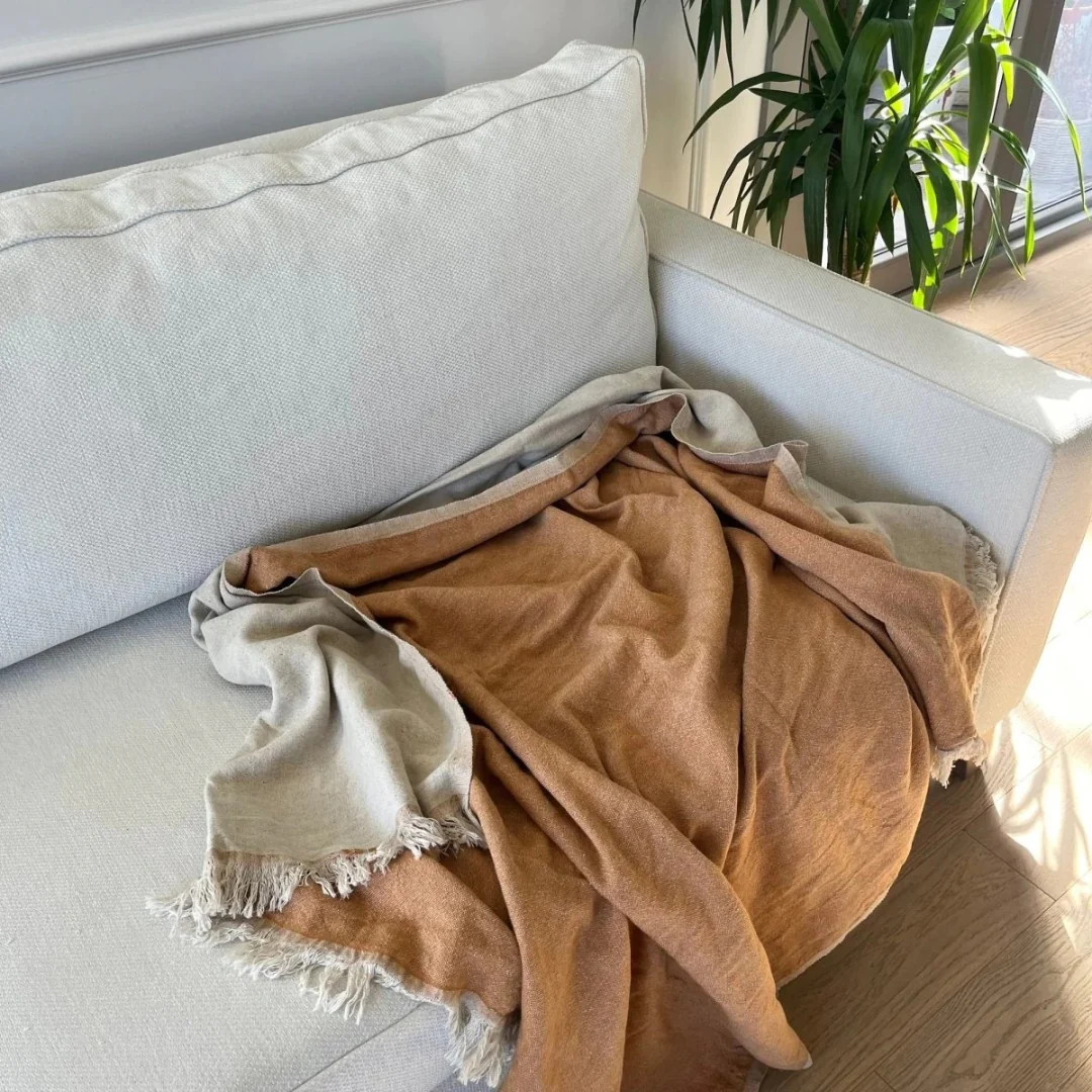 Es una manta confeccionada en lino y algodón, perfecta para añadir un toque de elegancia y confort a cualquier espacio. Su diseño ligero y suave con detalles de flecos proporciona una atmósfera relajante, ideal para momentos de descanso.