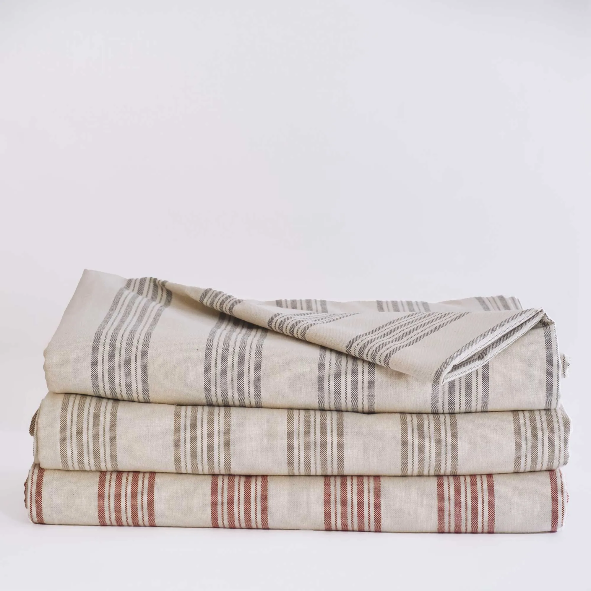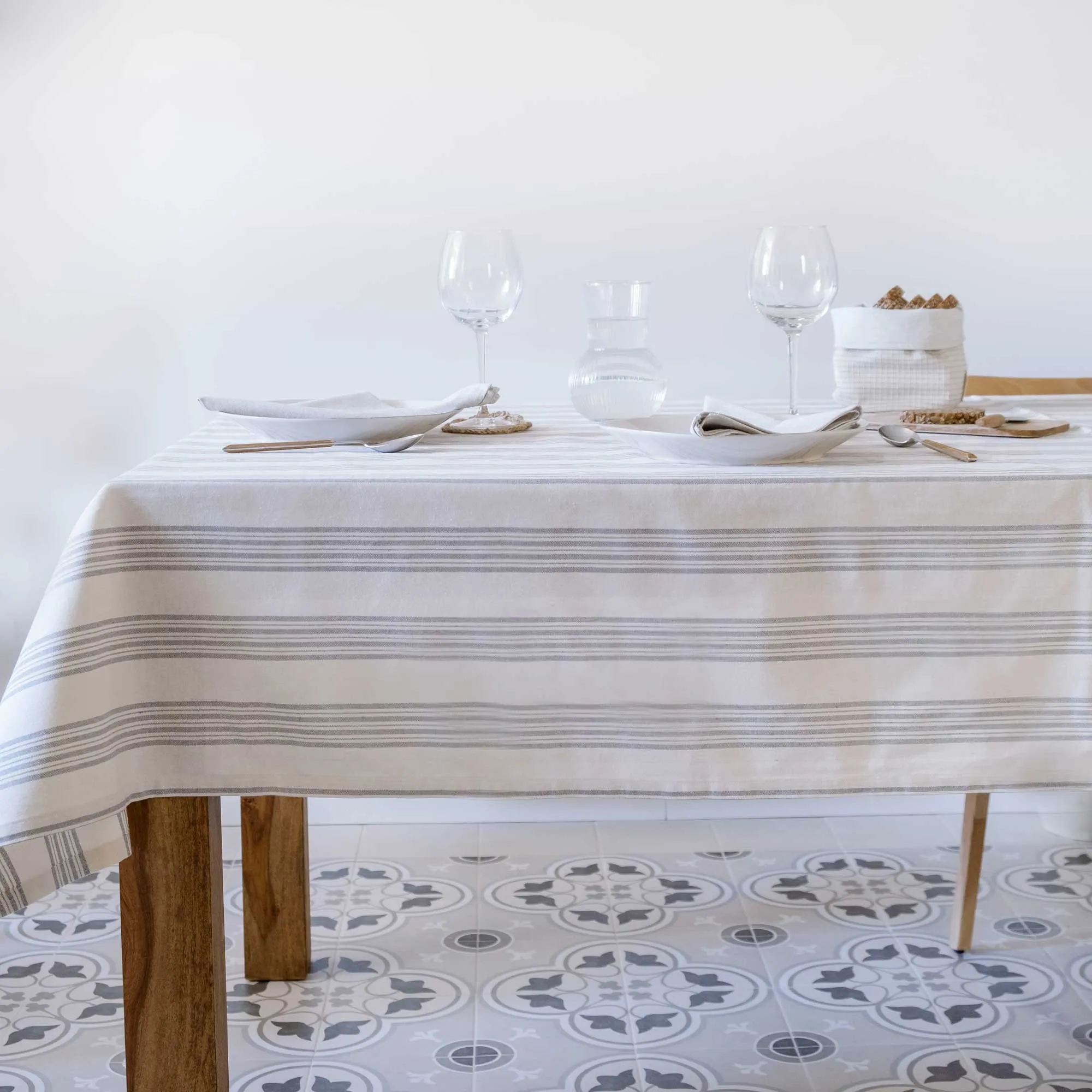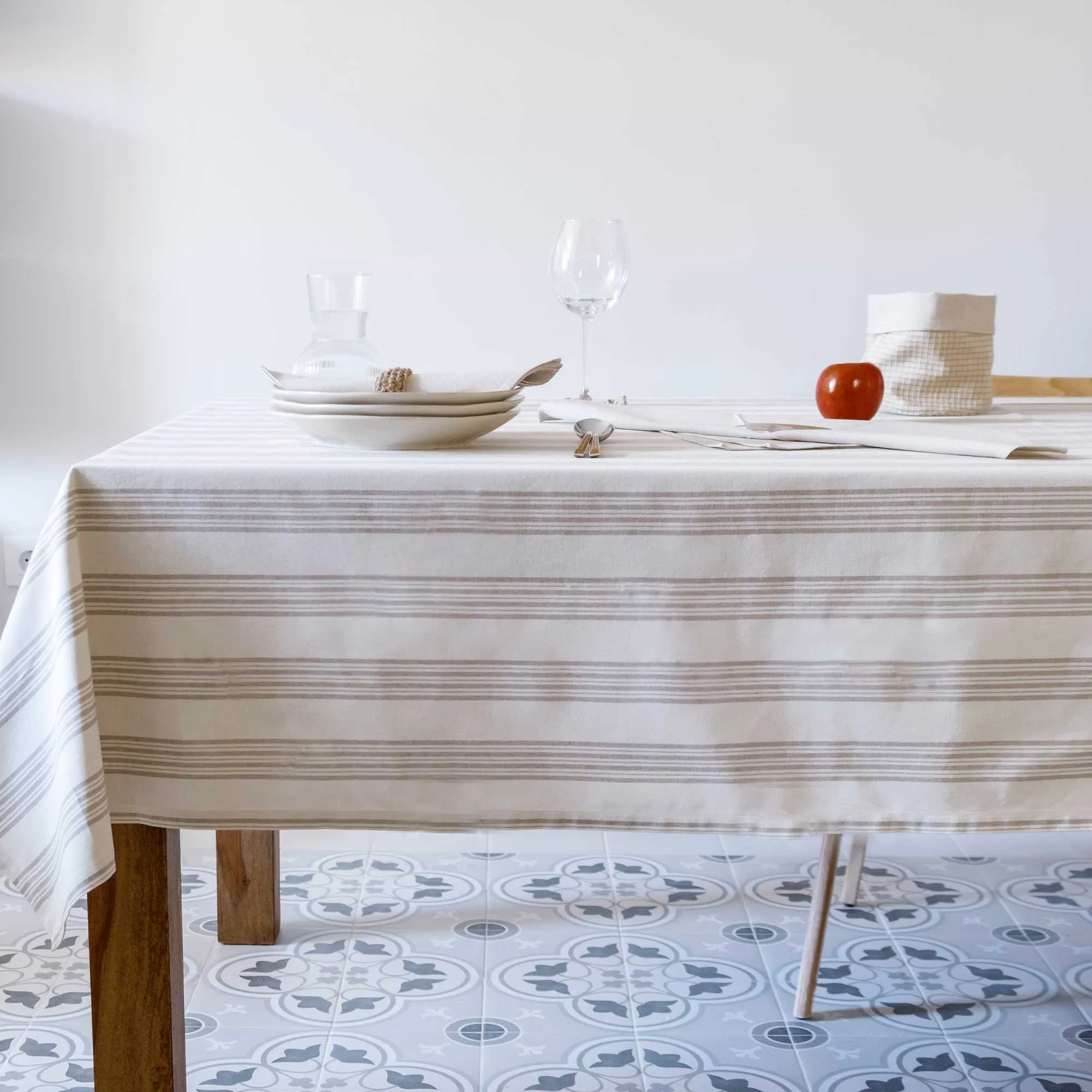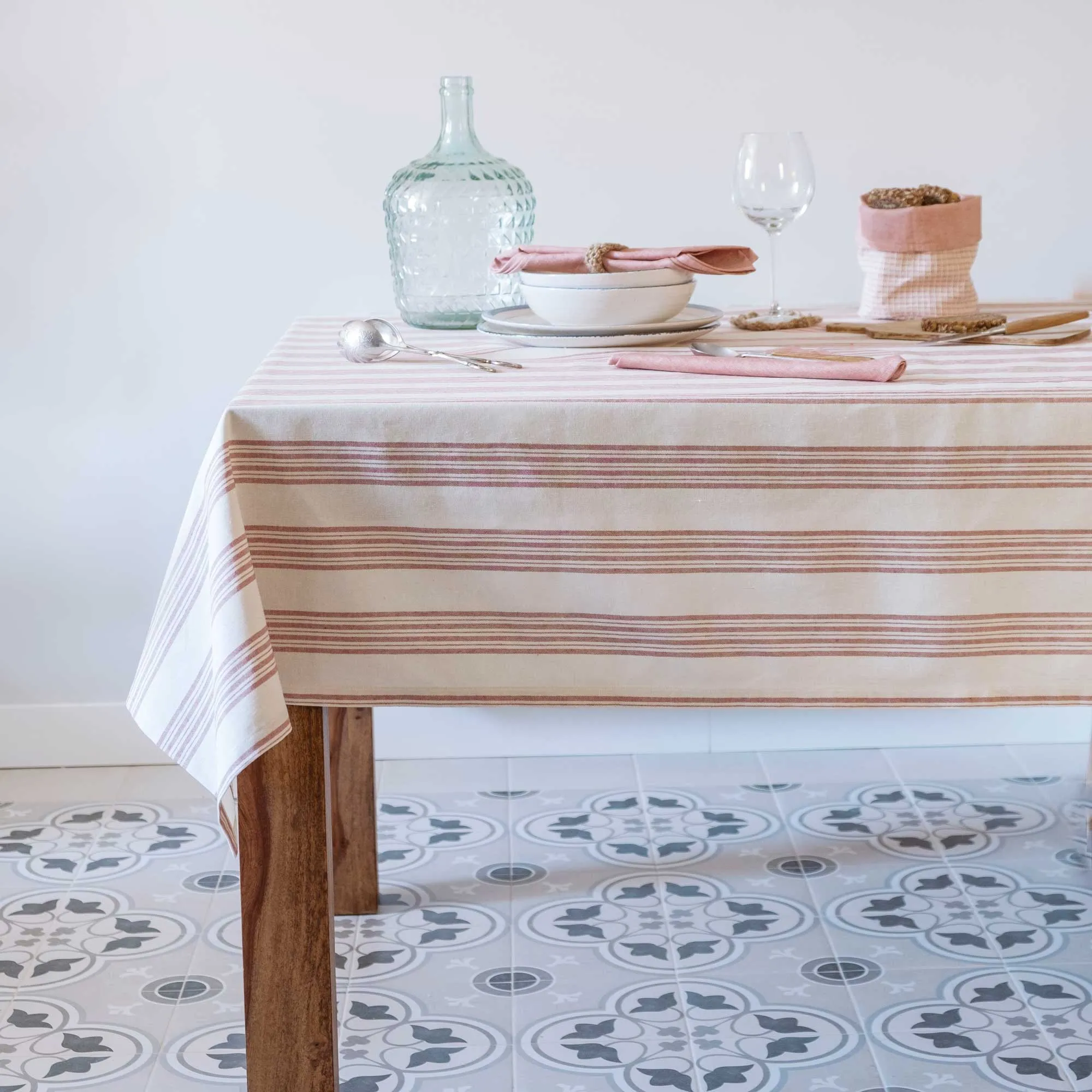 Mantel sostenible de algodón reciclado, confeccionado éticamente en España con un diseño de rayas.