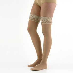 Media larga hasta el medio muslo, con sujeción de silicona y blonda. Indicada para varices sin edema, insuficiencia venosa, profilaxis antitrombótica. Talla: 4 Tobillo: 26-27 cm Pantorrilla: 40-42 cm Mitad Muslo: 54-56 cm