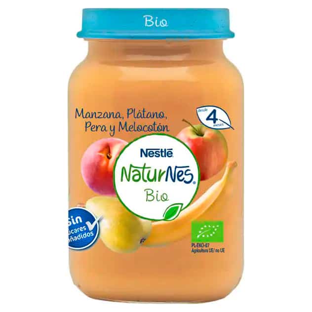 Alimento infantil. Puré de plátano, manzana, pera y melocotón.