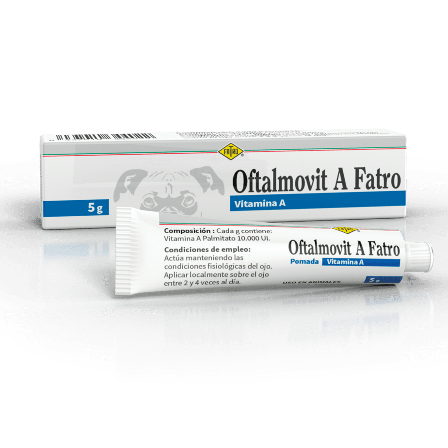 Oftalmovit a fatro vit a pomada 5gr es una pomada oftálmica que actúa manteniendo las condiciones fisiológicas del ojo, con las propiedades de la vitamina A. Está indicado para perros y gatos sobre todo en casos de ojo seco, úlcera corneal o glaucoma.