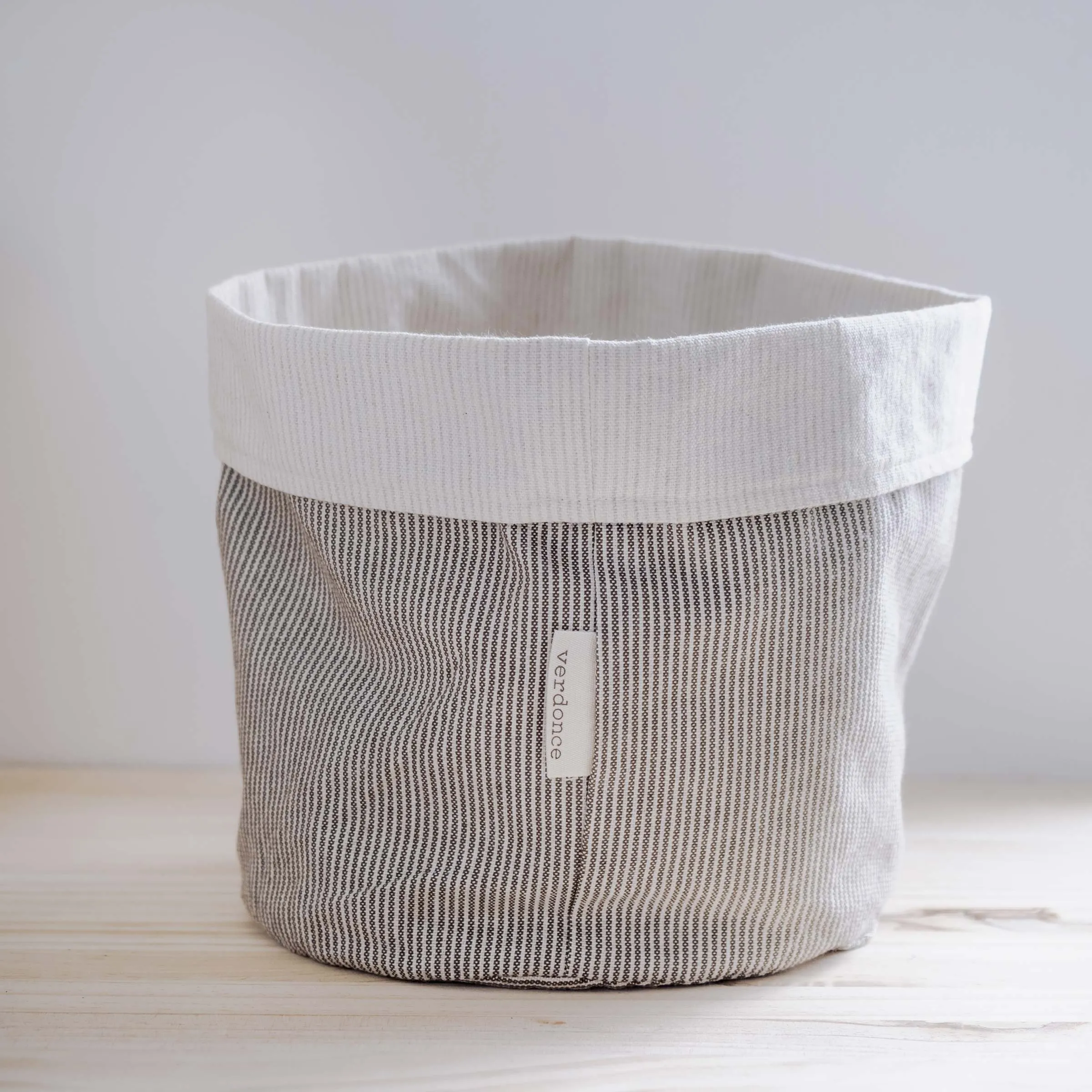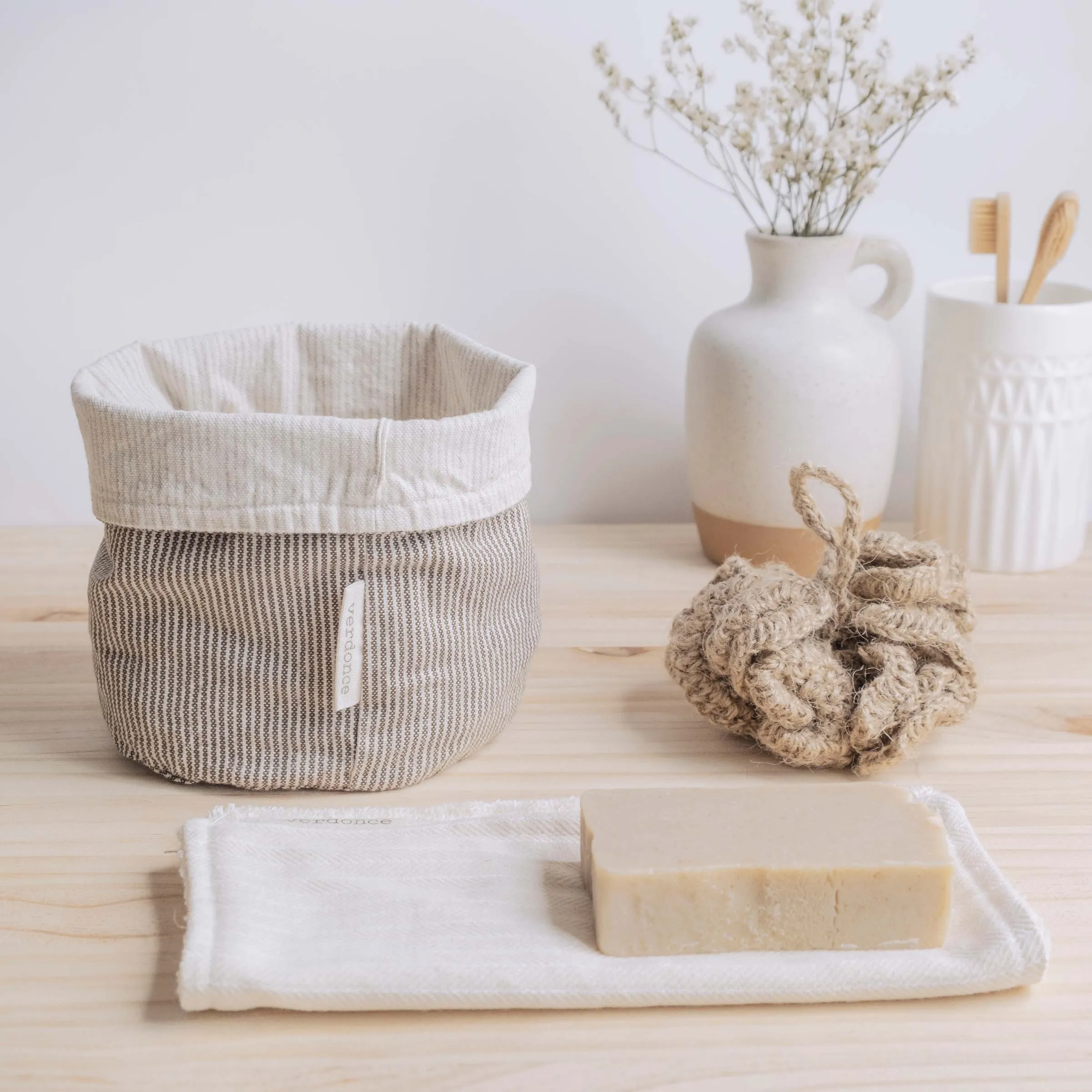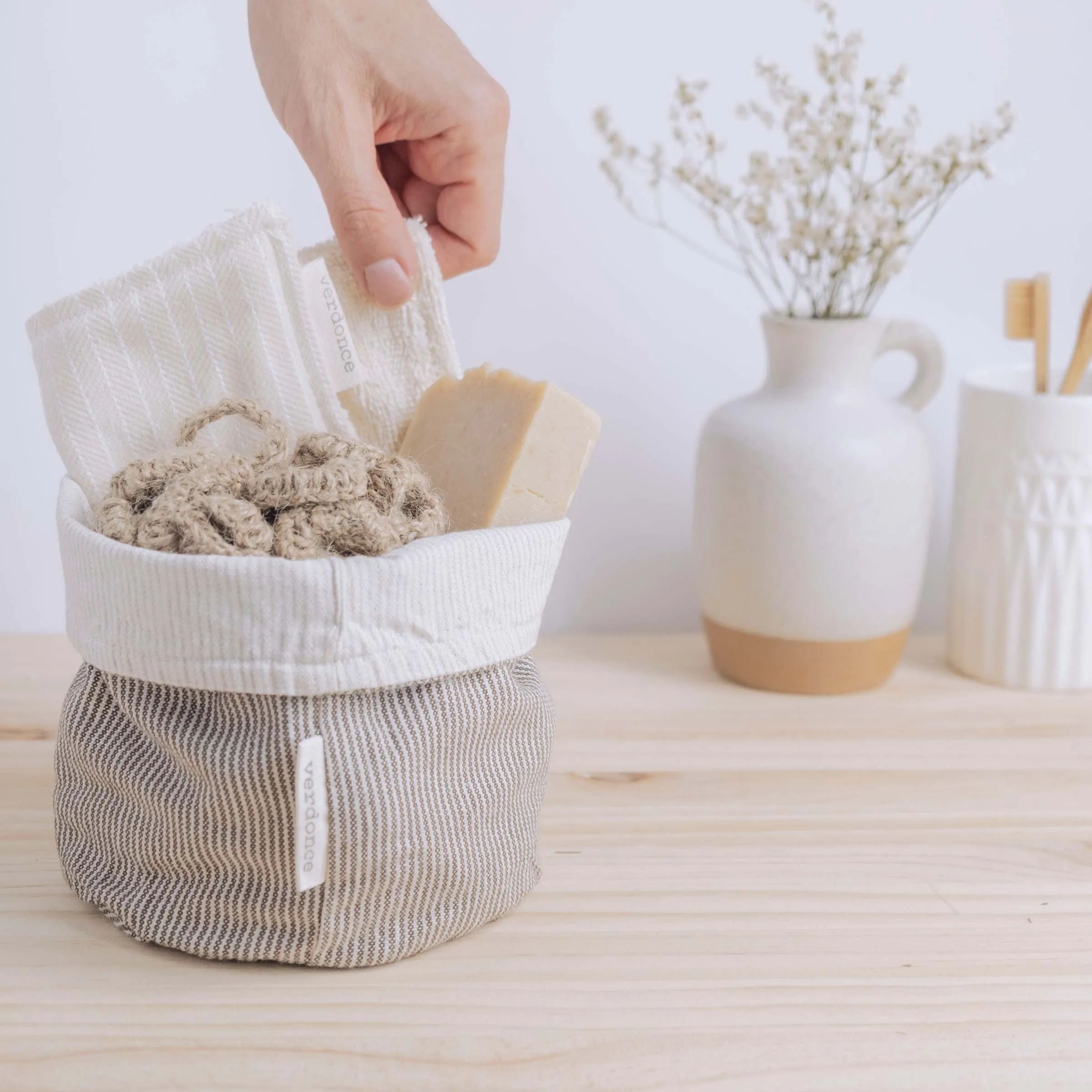 - Cesto multiusos de algodón reciclado reversible. Podrás utilizarlo como organizador para ordenar los básicos de baño o incluso para ordenar el armario, como panera o cubremaceta.