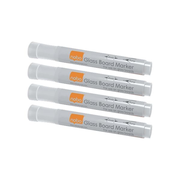 Pack de 4 rotuladores premium blancos de limpieza en seco para escribir en pizarras en vidrio.