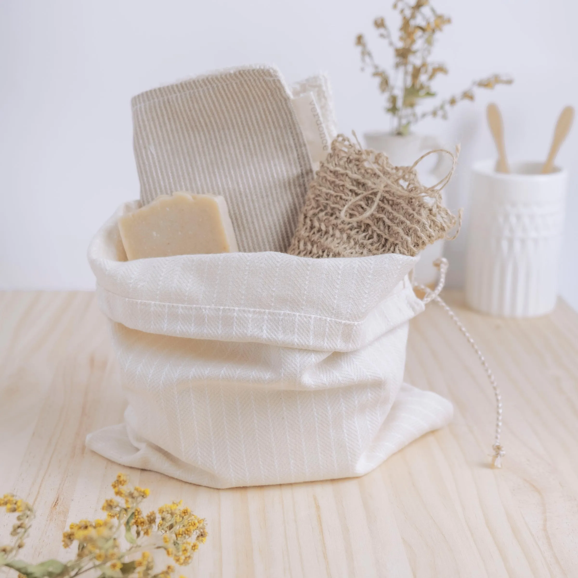 • 1 saquito de yute tejido para eliminar células muertas y activar circulación a la vez que te lavas con tu jabón favorito.