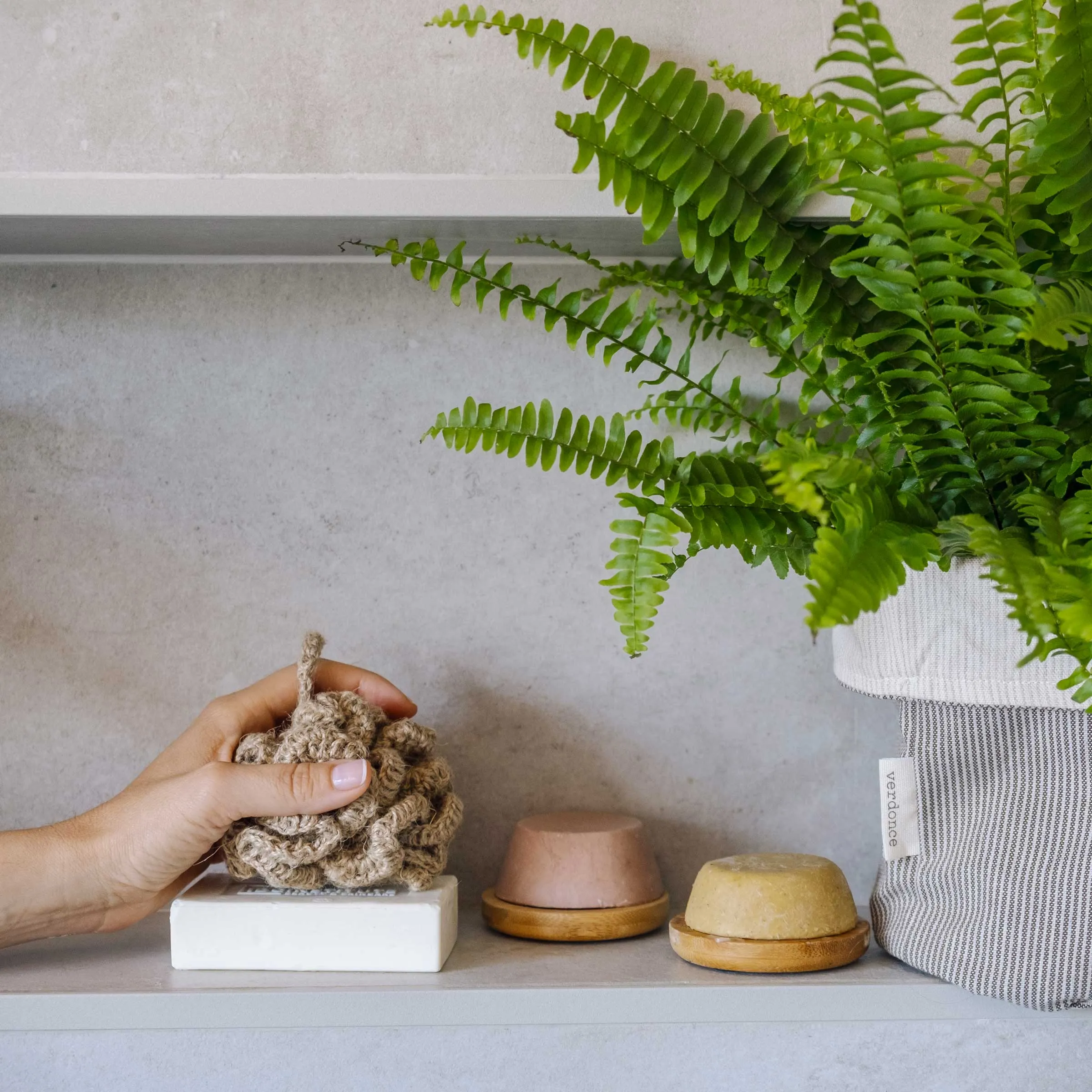 Esponja natural de yute para el baño para eliminar celulas muertas y activar circulación sanguinea. Esta esponja artesanal es totalmente natural; no saca nada del mar y no envía plástico de vuelta. Tejido a ganchillo con amor a partir de hilos de yute natural en España por mujeres locales en situaciones vulnerables. Un artículo con encanto y concienzudo para tu baño de residuo cero.