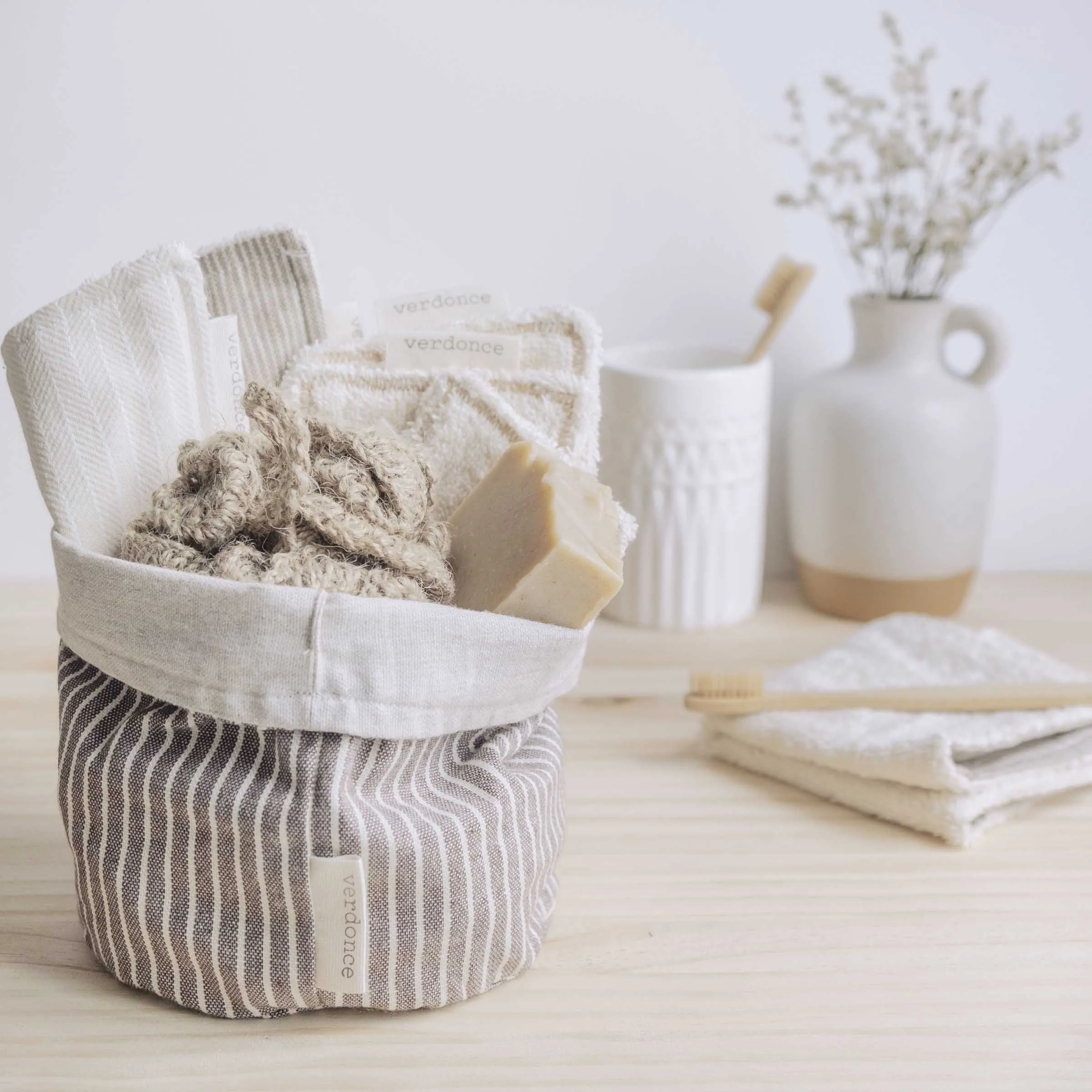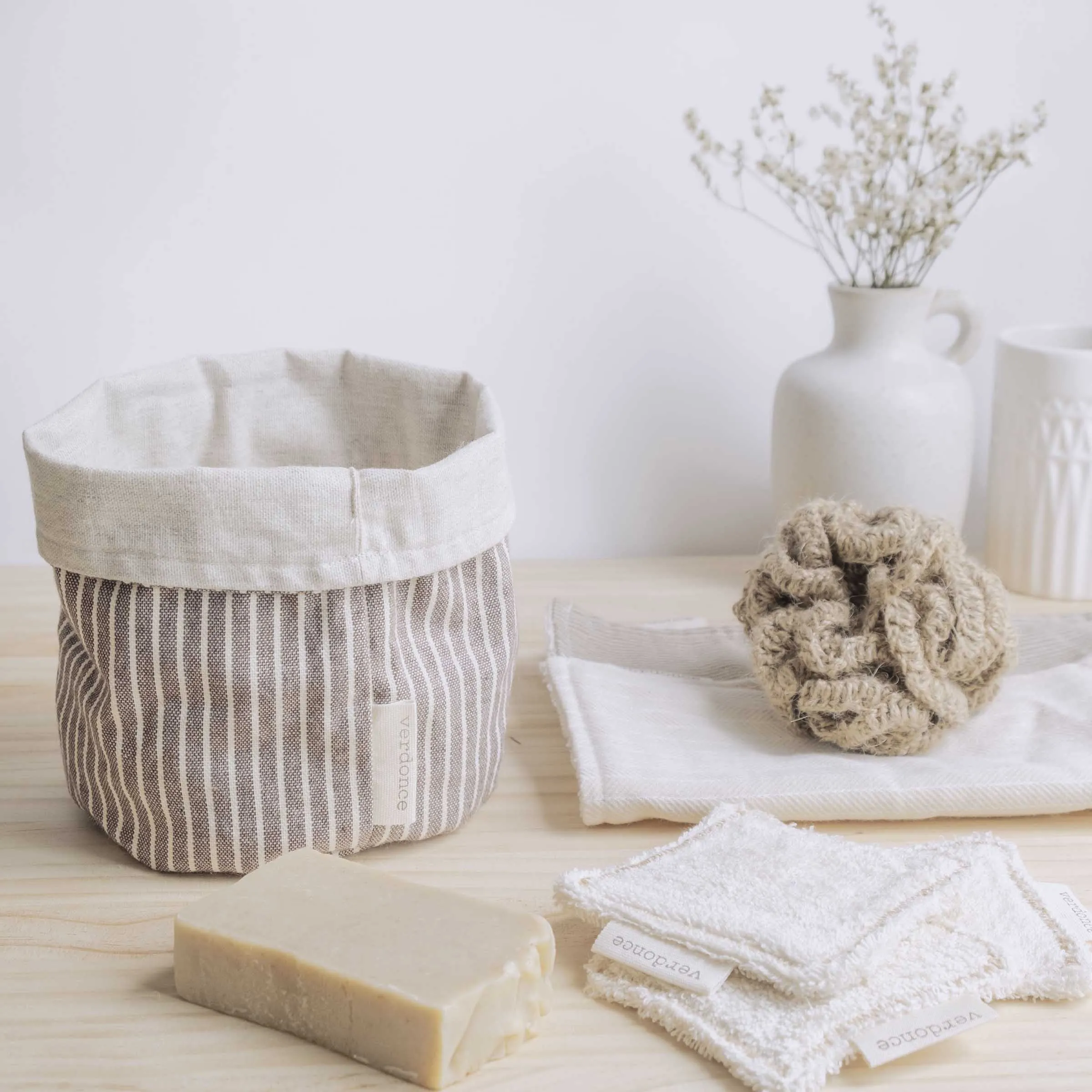 Cesto para tu hogar eco. Ideal como como organizador para ordenar los básicos de baño o incluso para ordenar el armario. También es ideal como panera o cubremacetas para plantas ¡Además es reversible! El cesto de algodón reciclado Verdonce, ha sido confeccionado artesanalmente en España con los mejores materiales sostenibles, sin químicos ni plástico.