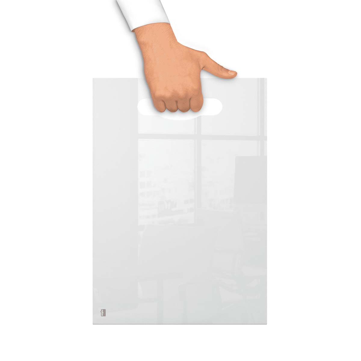 Portapapeles clipboard en vidrio transparente templado, para escritura directa con rotulador o uso de papel hasta tamaño A4, para uso como portapapeles de mano. Incluye mini marcador.