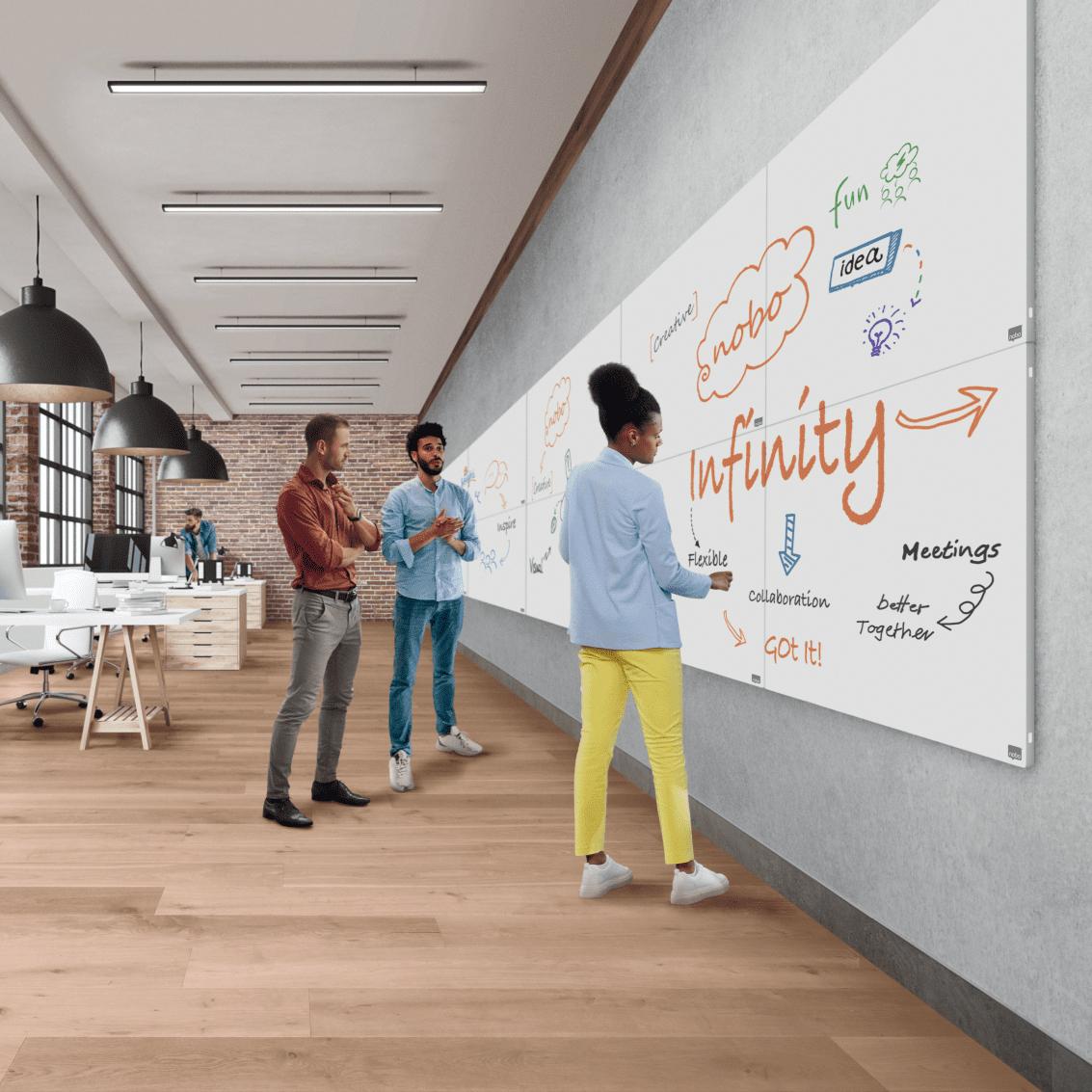 Esta elegante pizarra magnética sin marco es la herramienta de colaboración ideal para cualquier entorno de oficina. Su diseño modular te permite crear y ampliar tu espacio de escritura para adaptarlo a tus necesidades sin límites.