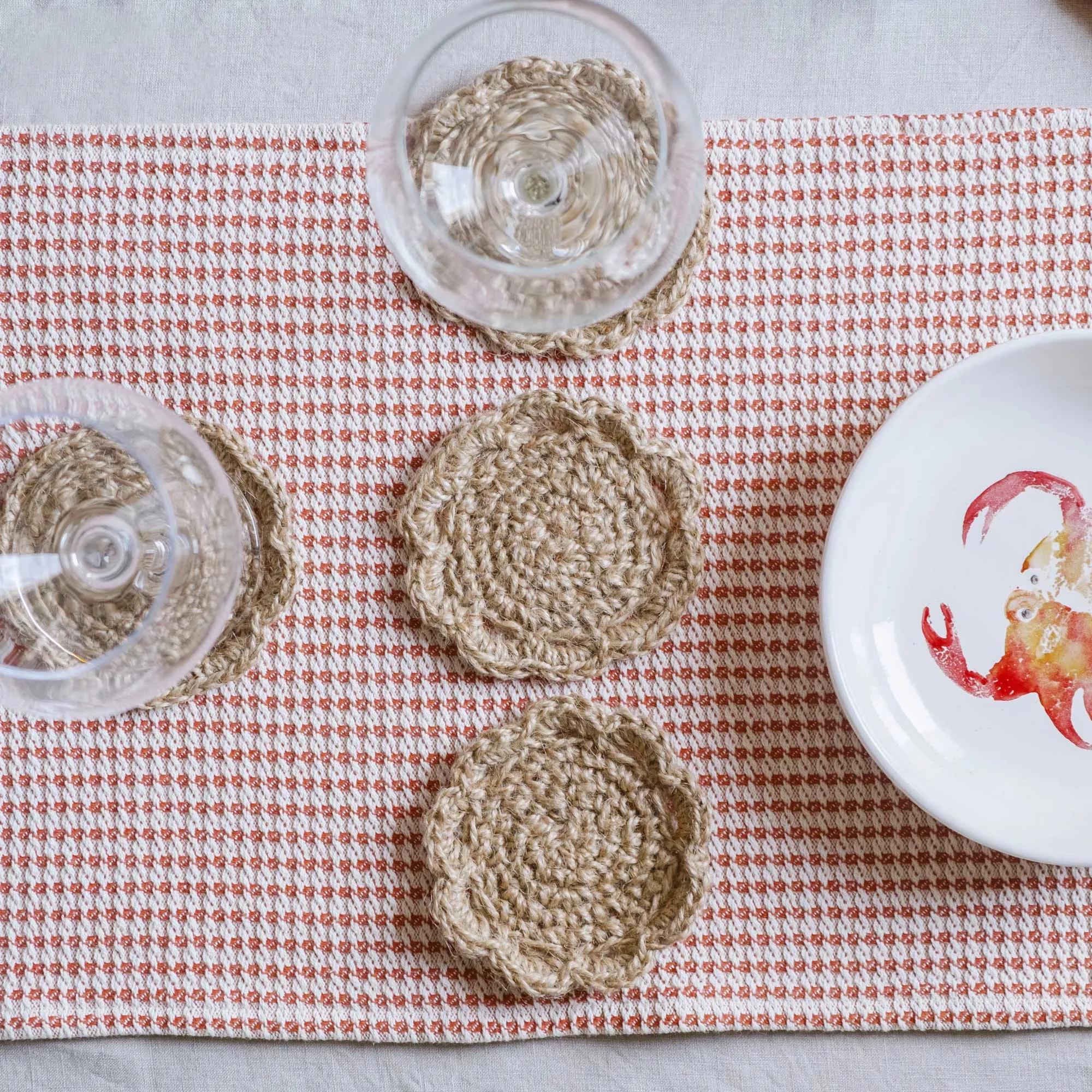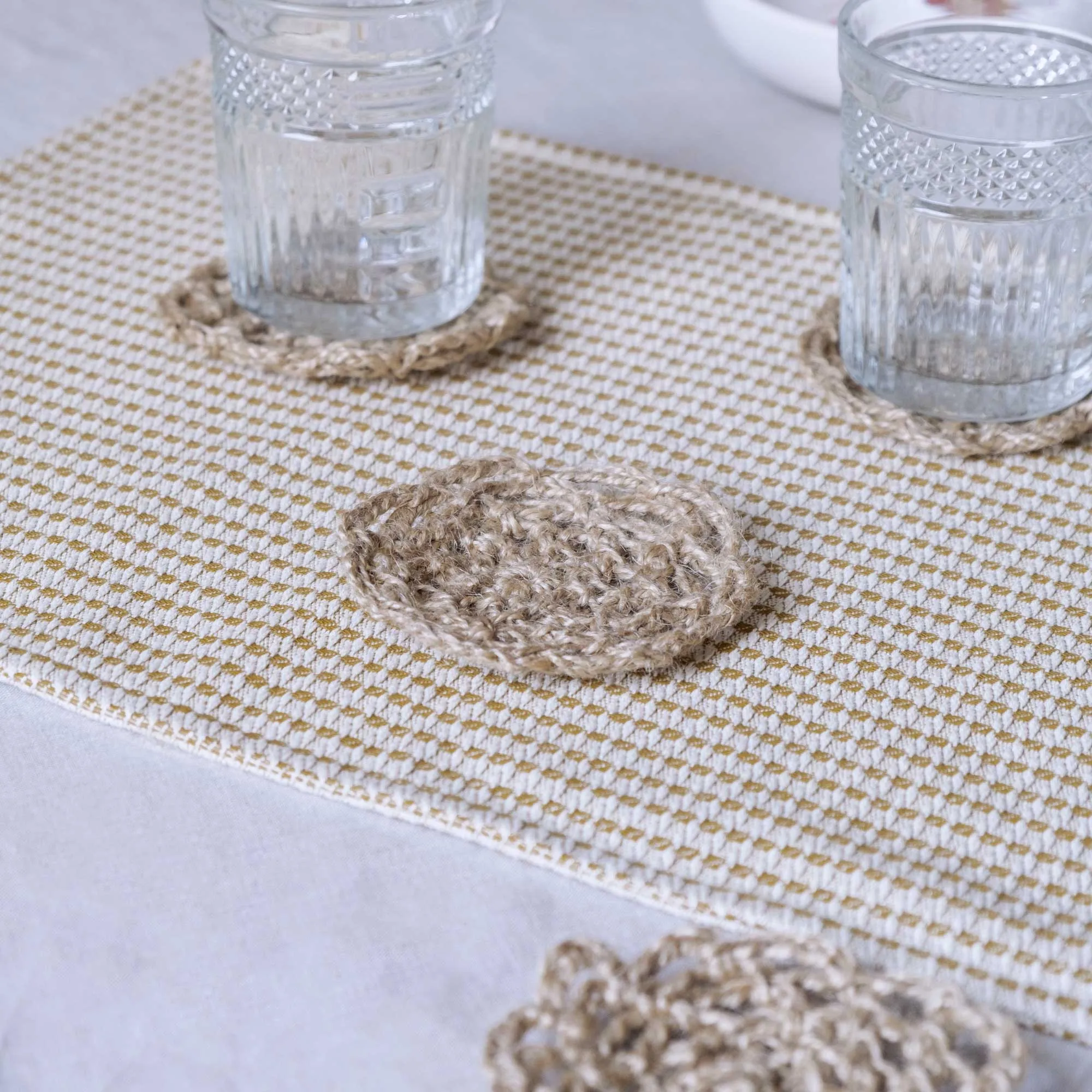 Posavasos de yute tejidos a ganchillo de forma ética y sostenible en España. Ideales para cualquier vaso, taza o copa dando un toque cálido para adornar tu mesa bonita. Combinables con nuestros servilleteros de yute. Se vende en pack de 4 unidades.