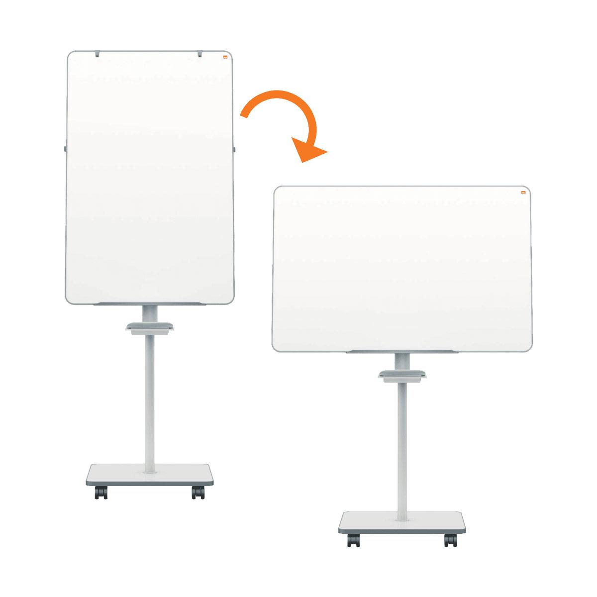 Pizarra de conferencias portátil de acero lacado en blanco, de doble cara, para escribir directamente con un rotulador o utilizando un bloc de papel, con caballete regulable en altura con ruedas, puede utilizarse en vertical o en horizontal.
