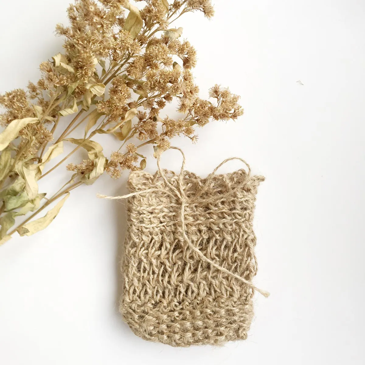 Saquito natural tejido a mano con hilo de fibra natural de yute. Ideal para lavarte el cuerpo con tu jabón favorito dentro a la vez que masajeas la piel para activar el sistema circulatorio y eliminar las células muertas. Además, sirve como funda para guardar el jabón y también para aprovechar los trocitos cuando ya son muy pequeños. Una opción excelente y muy eco para tu rutina de higiene sostenible.