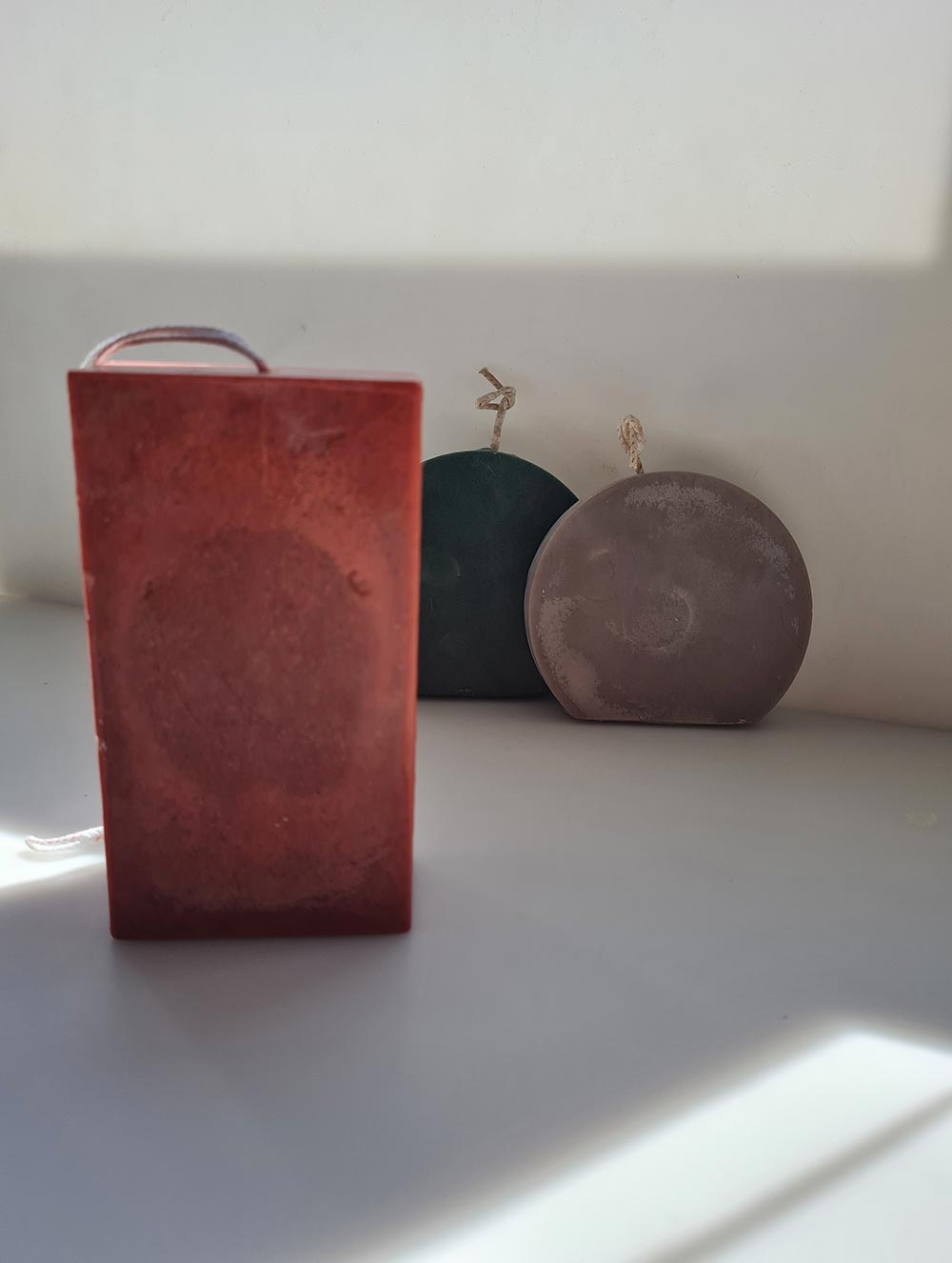 Vela de líneas rectas, con pigmentos naturales o neutra, sus colores tienen «vida» y cambian según pasa el tiempo.