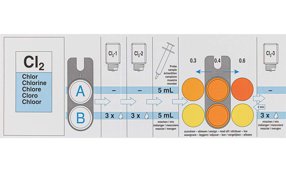 El cloro libre reacciona a un valor de pH de 5-6 con la N,N-dietil-1,4-fenilendiamina (DPD) formando un colorante rojo-violeta. Después de la adición de los iones yoduro, se puede determinar el cloro total (suma del cloro libre y del cloro combinado).
